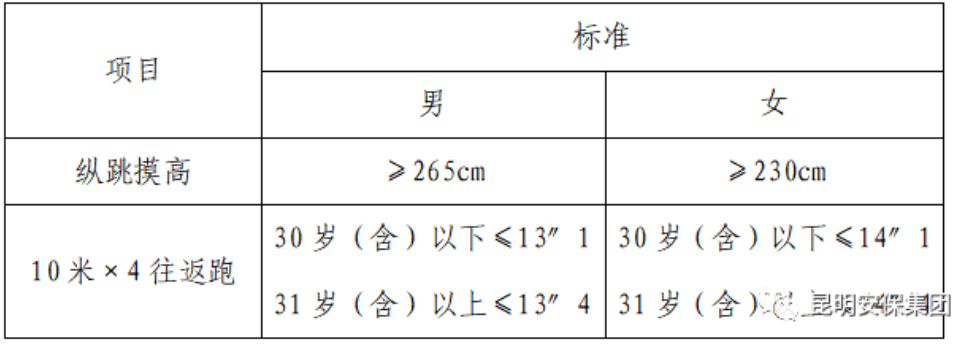 3.縱跳摸高、10米×4往返跑科目采取一票否決制,達到規(guī)定項目標(biāo)準(zhǔn)即為合格,否則為不合格,不合格人員不得參與后續(xù)環(huán)節(jié)的考核,測試標(biāo)準(zhǔn):
